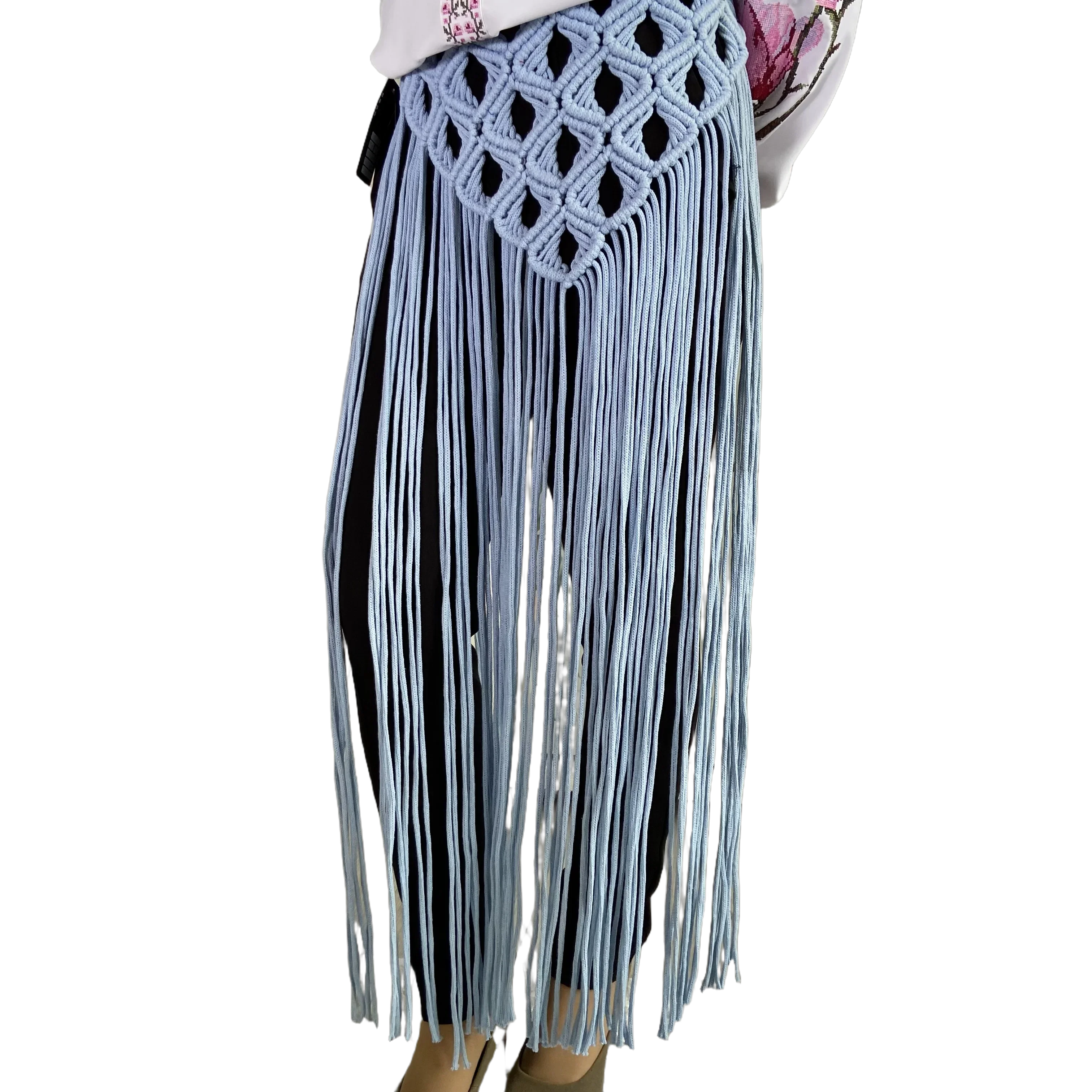 Припинда — це автентичний та водночас ультрасучасний аксесуар у стилі етно-бохо, що переосмислює традиційні елементи українського строю через призму майстерного плетіння макраме. Головною особливістю моделі є складна вузликова техніка, що формує чіткий геометричний візерунок із ромбів, які плавно переходять у довгу, динамічну торочку, що додає кожному руху особливої грації та об'єму. Виконана з міцного та приємного на дотик бавовняного шнура, «Плетенка» представлена у різноманітних відтінках — від пристрасного червоного до небесно-блакитного та стриманого бежевого, що дозволяє створювати безліч стильних комбінацій. Цей пояс-фартух ідеально лягає по фігурі, делікатно підкреслюючи талію та додаючи багатошаровості образу, незалежно від того, чи одягнете ви його поверх класичної вишиванки, чи поєднаєте із сучасною сукнею або штанами. Це вибір для сміливих та творчих особистостей, які прагнуть додати своєму гардеробу особливої фактурності, автентичного шарму та духу вільної стихії.