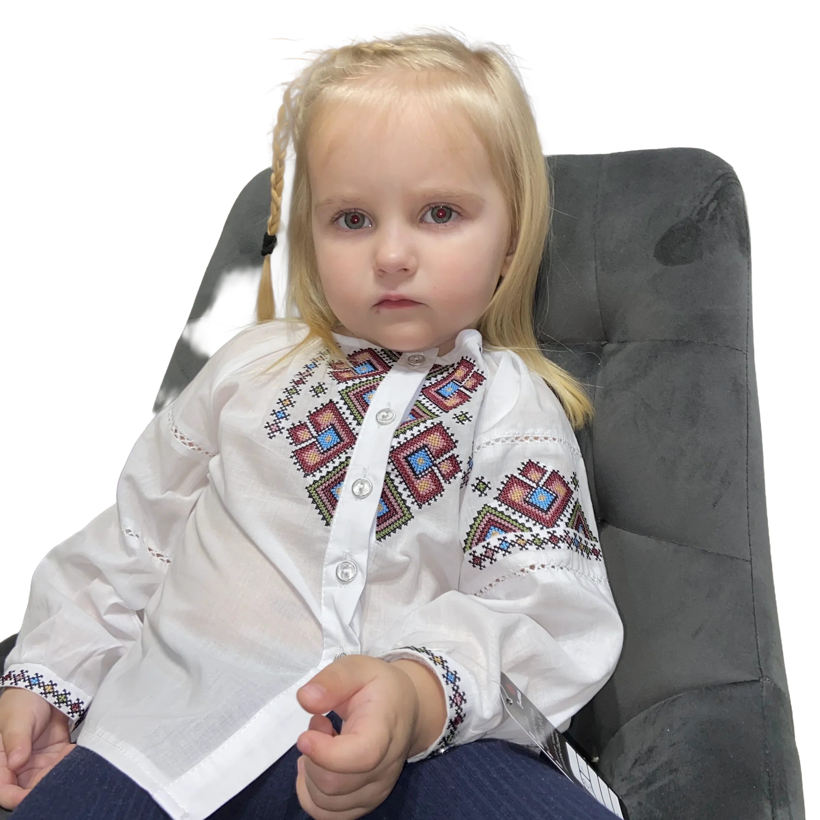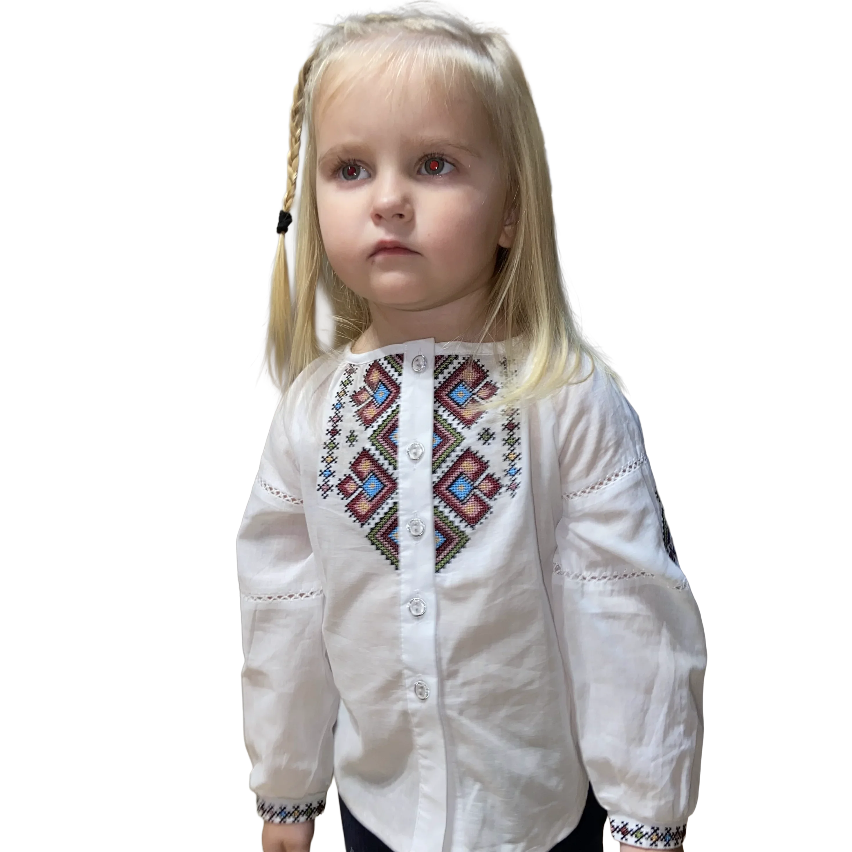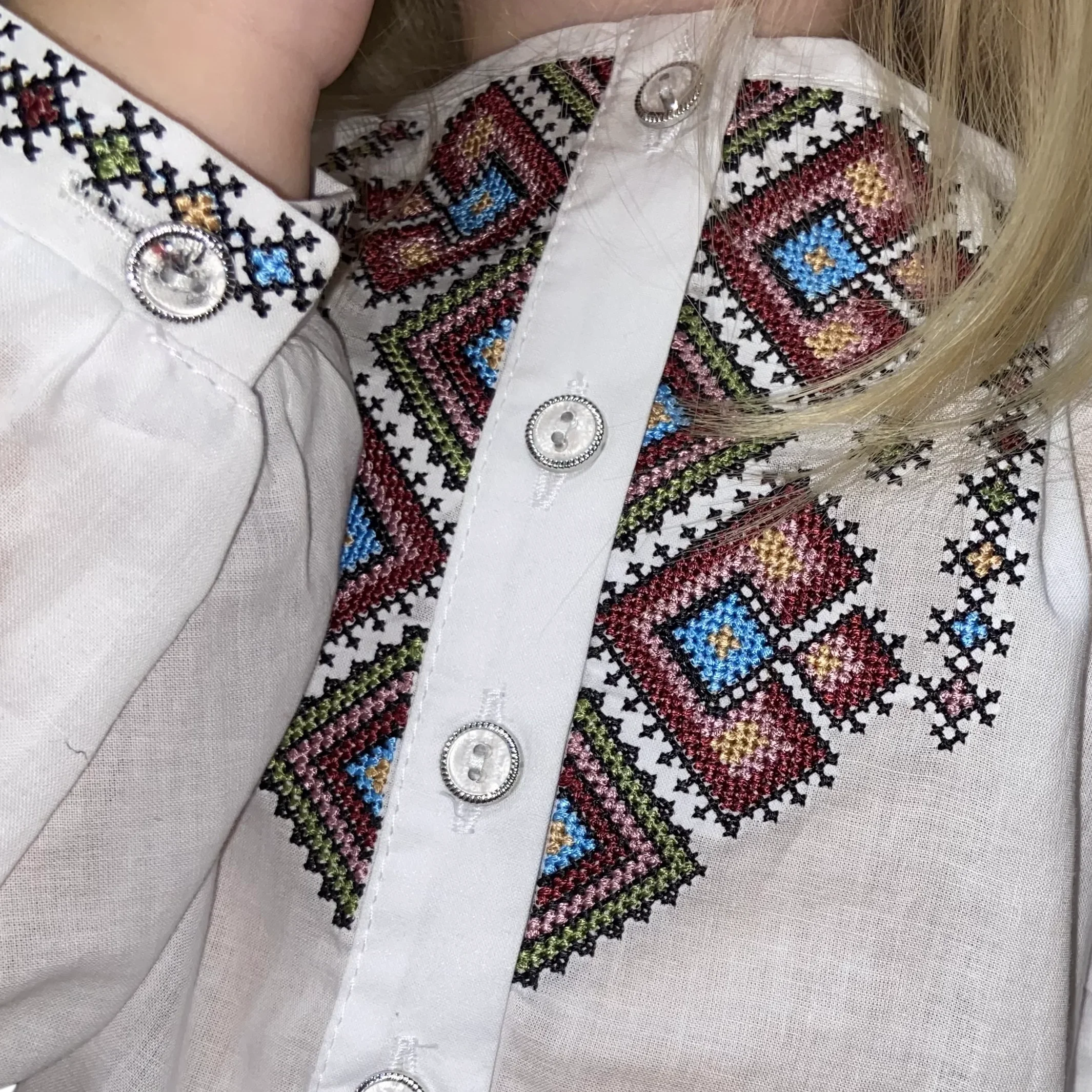 Вишиванка «Веселка» створена, щоб дарувати радість та підкреслювати неповторний стиль вашої маленької модниці. Білосніжне полотно сорочки стає ідеальним фоном для дивовижної багатоколірної вишивки, яка немов увібрала в себе всі барви літа. Унікальна геометрична композиція на грудях, виконана нитками різних відтінків — від глибокого синього та теракотового до ніжного жовтого та зеленого. Ці візерунки символізують радість, здоров’я та багатогранність життя. Ця модель — справжній універсальний солдат у гардеробі. Вона миттєво перетворить звичайний образ на святковий. Завдяки різнобарвному візерунку, її легко поєднувати зі спідницями, брюками чи джинсами будь-яких кольорів. Вишиванка «Веселка» ідеально підходить для урочистостей, шкільних буднів, сімейних свят та яскравих фотосесій.
