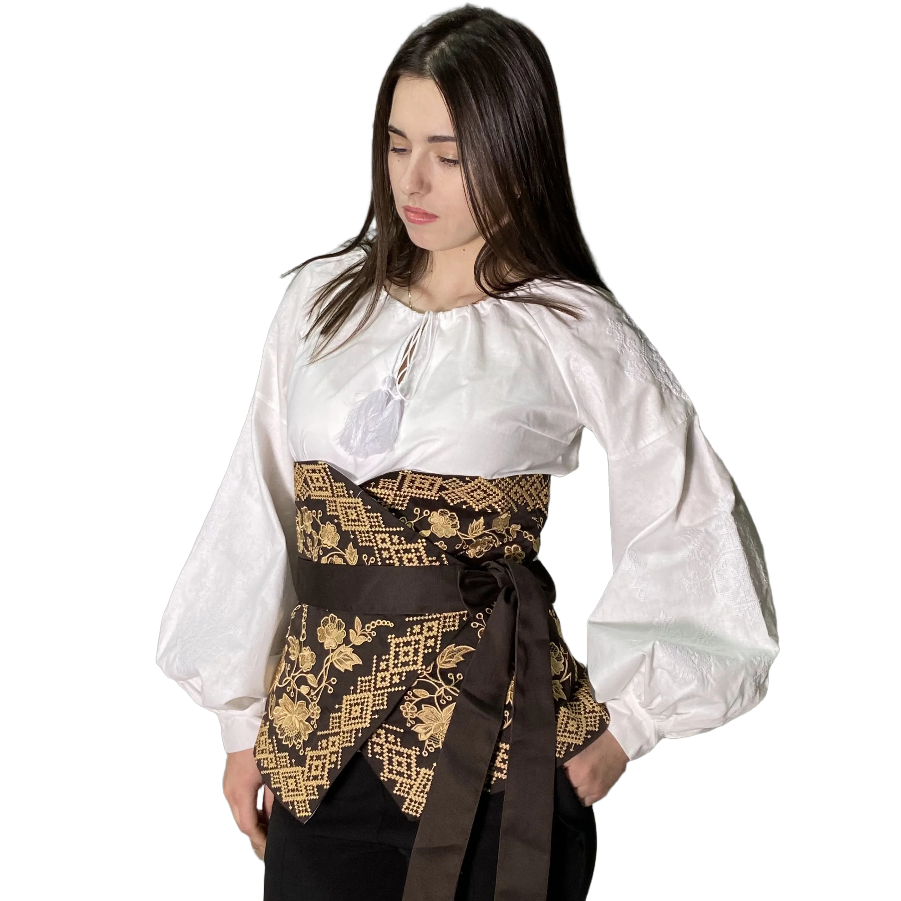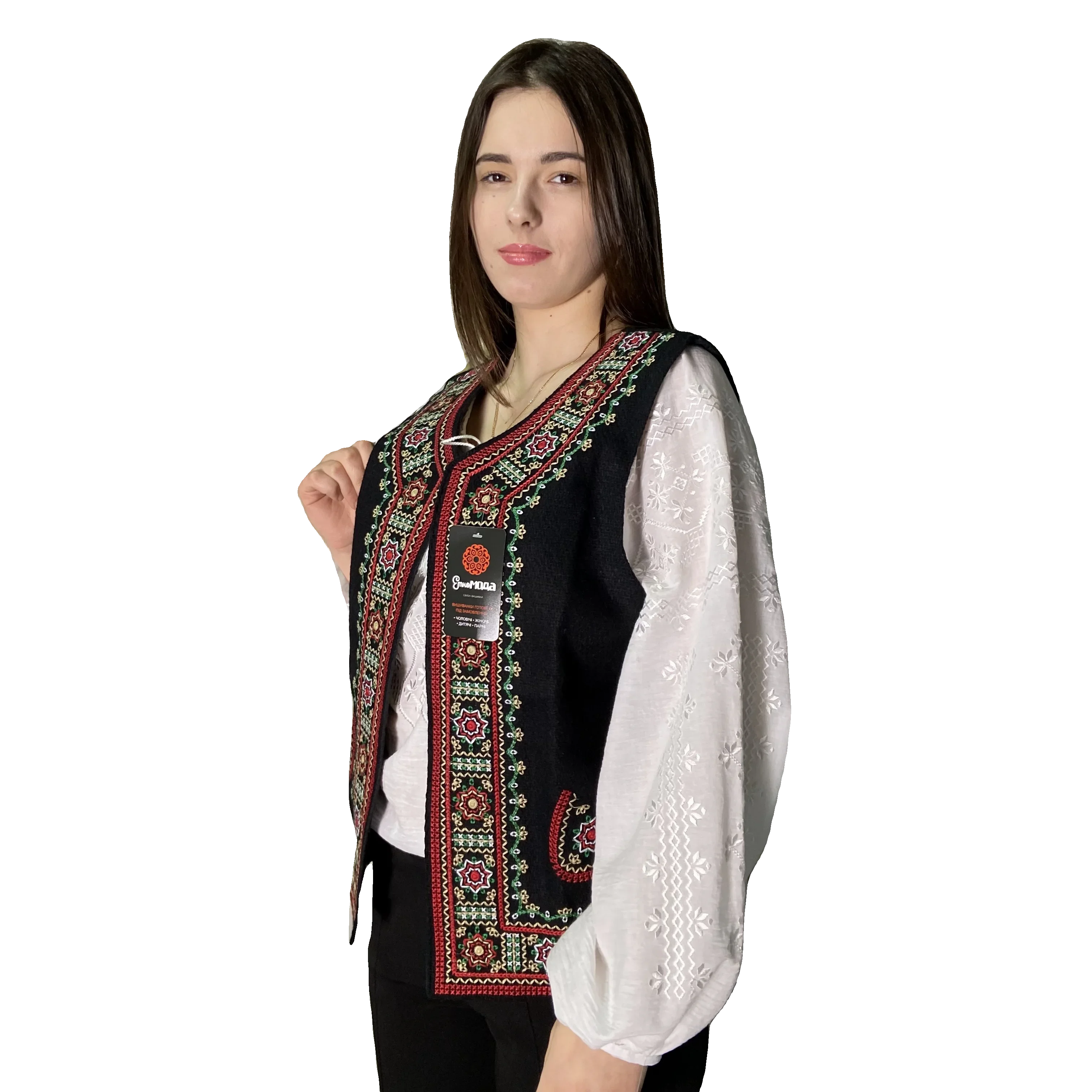 Вишиванка Зореслава — це справжній гімн жіночності та майстерності, де білосніжне полотно стає основою для розкішного багатоколірного орнаменту. Головним акцентом моделі є багата вишивка на грудях та рукавах, виконана у складній техніці, що поєднує фіолетові, блакитні, жовті та зелені відтінки. Геометричні ромби та зірчасті мотиви створюють щільний візерунок, який виглядає об’ємно та святково, підкреслюючи унікальність виробу. Пишні рукави прикрашені як широкими орнаментальними вставками, так і делікатними вертикальними доріжками, що додає образу вишуканості та візуальної легкості. Вільний крій та натуральна тканина забезпечують комфорт і свободу рухів, роблячи сорочку ідеальним вибором як для урочистих подій, так і для створення особливих повсякденних образів. Акуратна горловина та лаконічні манжети зосереджують усю увагу на деталізованій вишивці, яка виступає справжнім оберегом для своєї власниці. Вишиванка Зореслава гармонійно поєднується з класичними брюками або спідницями, дозволяючи кожній жінці відчути себе частиною великої культурної спадщини, зберігаючи при цьому сучасний стиль та елегантність.