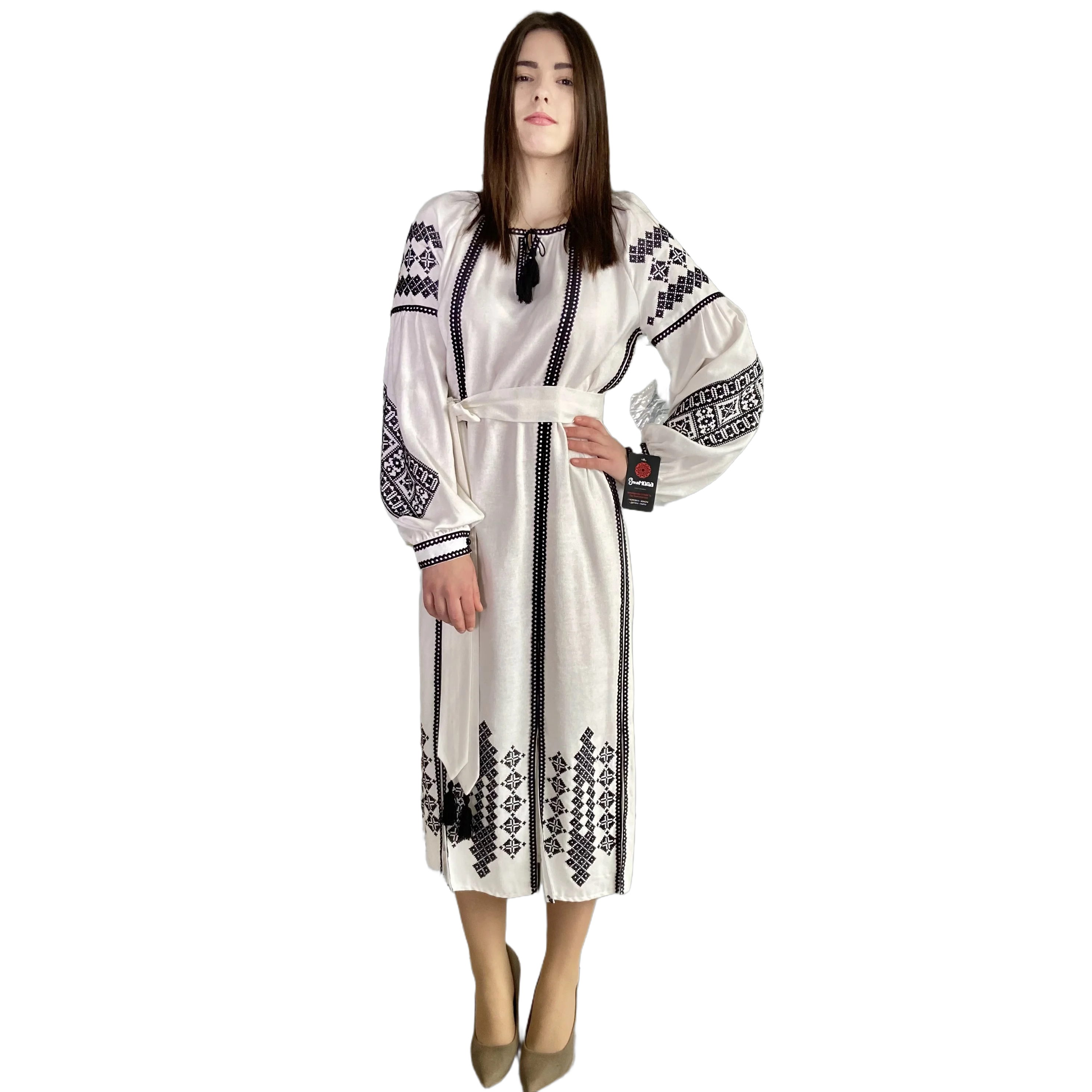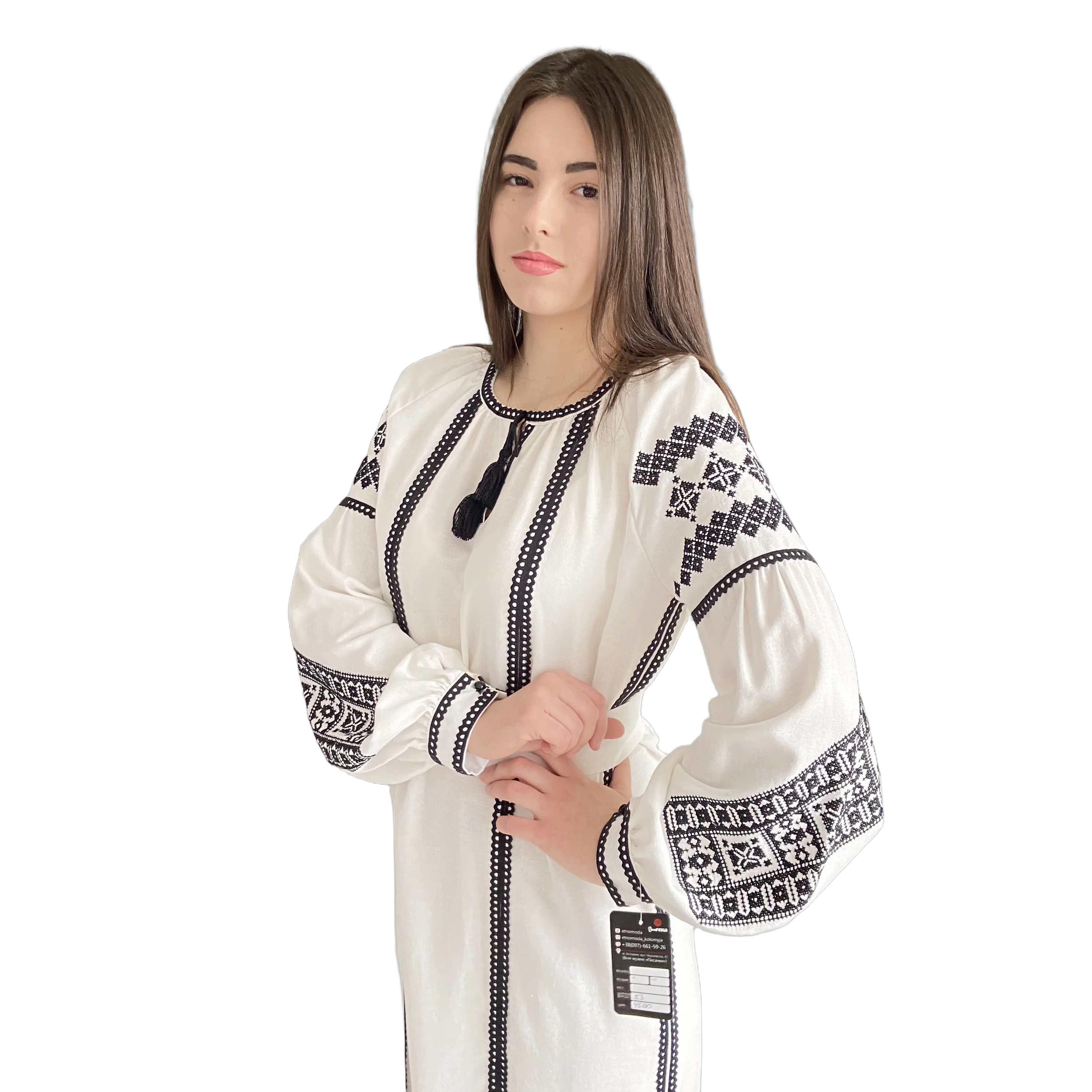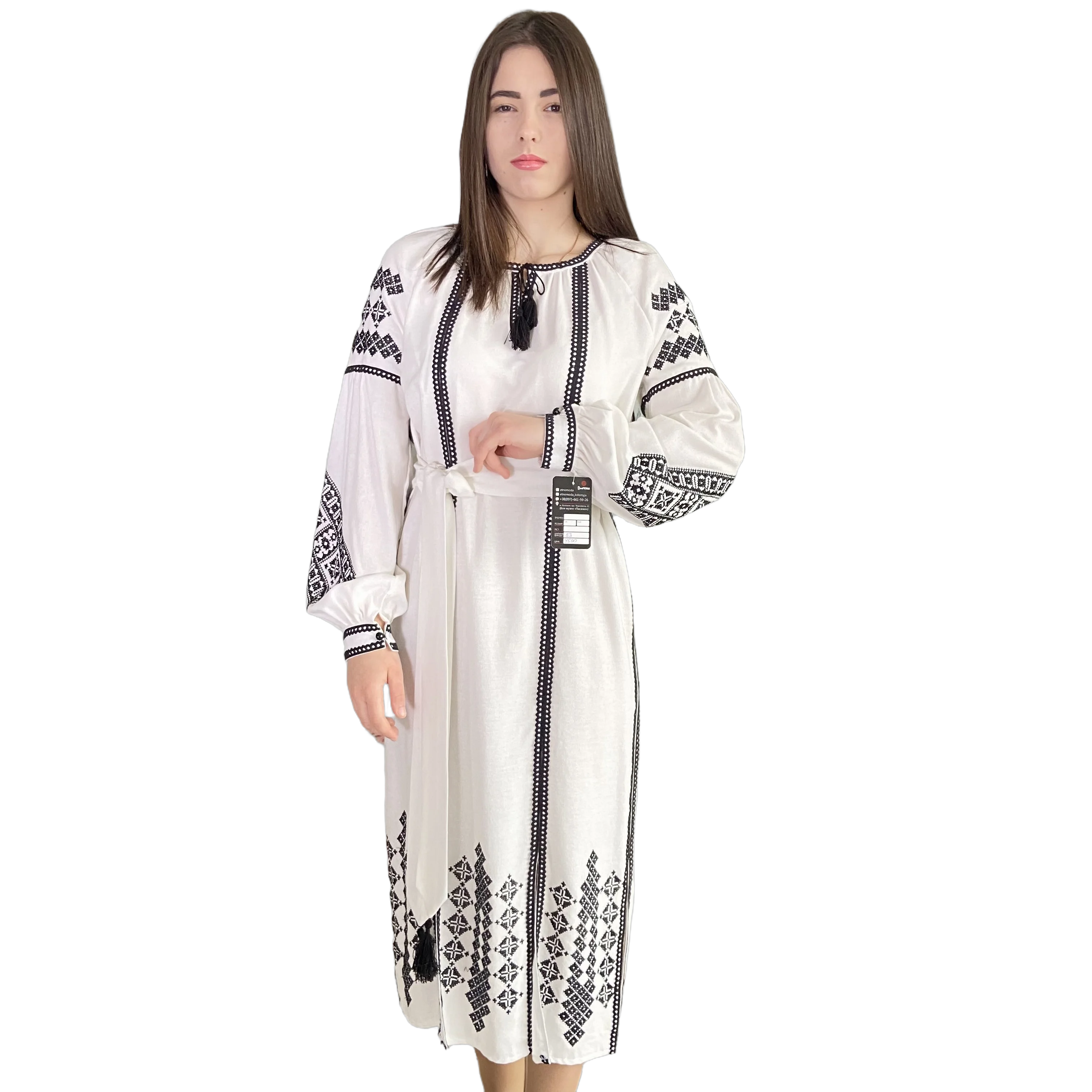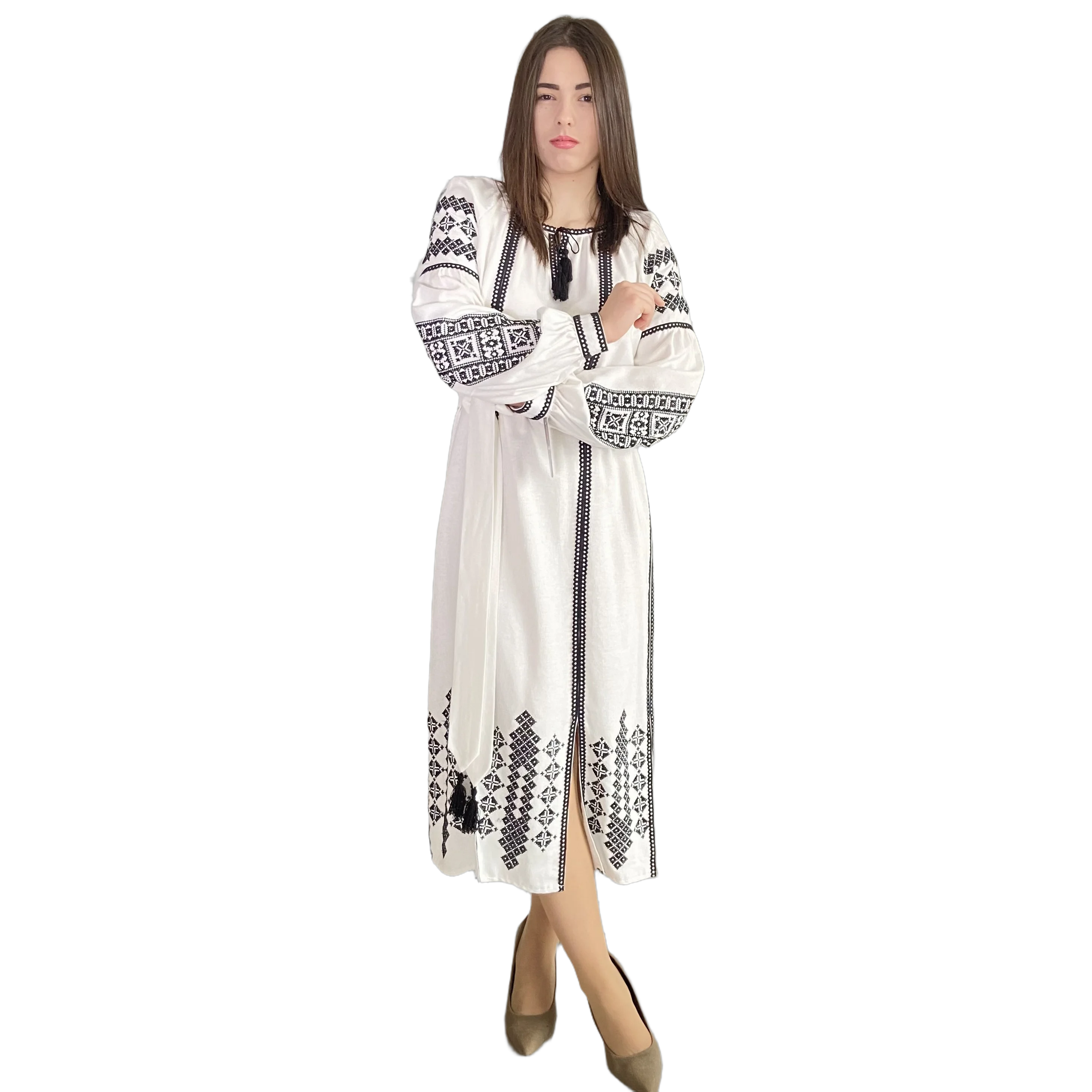 Сукня-вишиванка «Полісся» — це досконале поєднання лаконічності та глибокого символізму, де класична чорно-біла гама підкреслює шляхетність і силу традиційного українського строю. Головною особливістю моделі є строга геометрична вишивка, що вертикальними смугами проходить вздовж усього полотна та прикрашає пишні рукави, візуально видовжуючи силует і надаючи образу особливої статності. Низ спідниці оздоблений масивним орнаментом із ромбів та хрестів, які здавна вважалися потужними оберегами, що символізують засіяне поле та добробут роду. Виконана з високоякісного білого льону, сукня забезпечує неперевершений комфорт і легкість, а довгий тканинний пояс із об'ємними чорними китицями дозволяє делікатно підкреслити талію, створюючи жіночний та сучасний образ у стилі етно-модерн. Вишукана горловина з контрастними зав’язками додає вбранню завершеності, роблячи його ідеальним вибором для урочистих подій або ділових зустрічей, де ви хочете виглядати впевнено, стримано та водночас неймовірно стильно. «Полісся» від EtnoModa — це маніфест вашої ідентичності, що поєднує в собі спокійну впевненість північного краю та бездоганний смак сучасної жінки.
